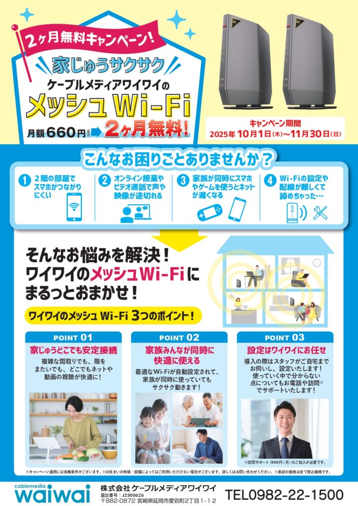 インターネットのオプションサービス「ワイワイメッシュWi-Fi」を開始いたします。