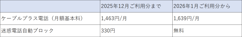 2026年1月1日より、ケーブルプラス電話および迷惑電話自動ブロックオプションの月額利用料とサービス内容を改定させていただきます。