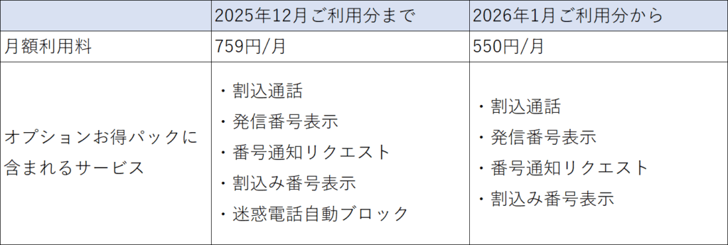 迷惑電話自動ブロックの月額利用料の無料化に伴い、オプションお得パックのサービス内容・月額利用料も以下の通り改定いたします。