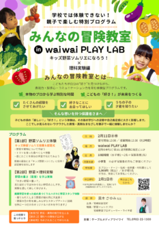 2月11日(水・祝)にwaiwaiPLAYLAB(ワイワイプレイラボ)にて、小学生を対象にした、学校では体験できない!親子で楽しむ特別プログラム「みんなの冒険教室 in waiwai PLAY LAB」を開催します。