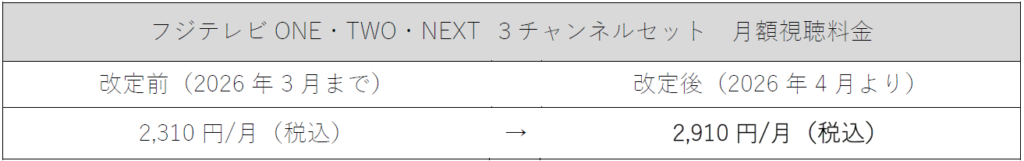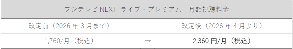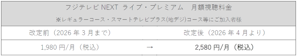 この度、株式会社フジテレビジョンが運営しております有料チャンネル「フジテレビNEXT ライブ・プレミアム」につきまして、番組供給元の都合により2026年4月1日(水)から、以下の通り視聴料金を改定させていただくことなりました。