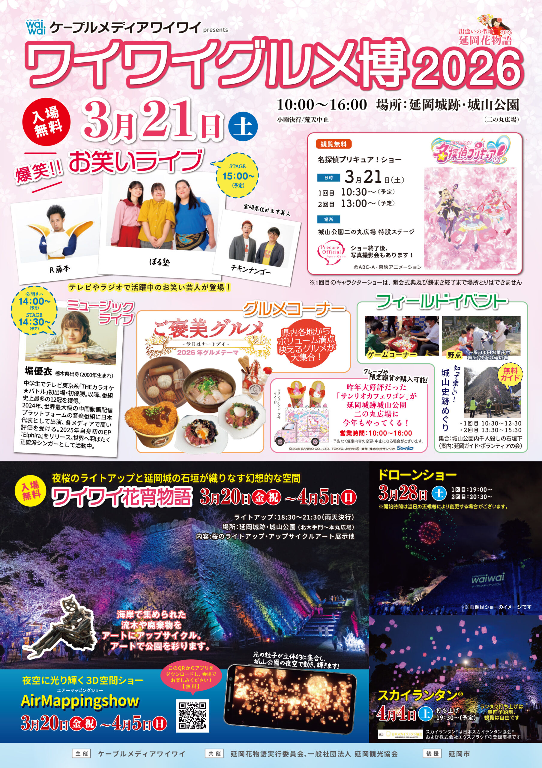 延岡花物語のラストを飾る「ワイワイ花物語」を、3月20日(金・祝)~4月5日(日)延岡城跡・城山公園で開催します。