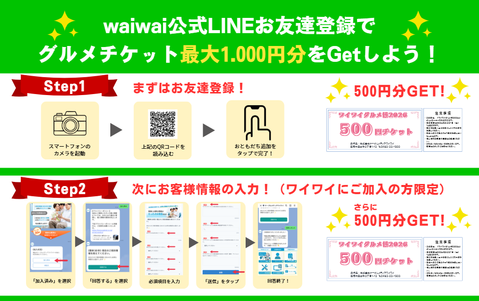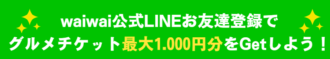 ワイワイ公式LINEを登録するとグルメ博で使えるグルメチケット最大1,000円分プレゼント!